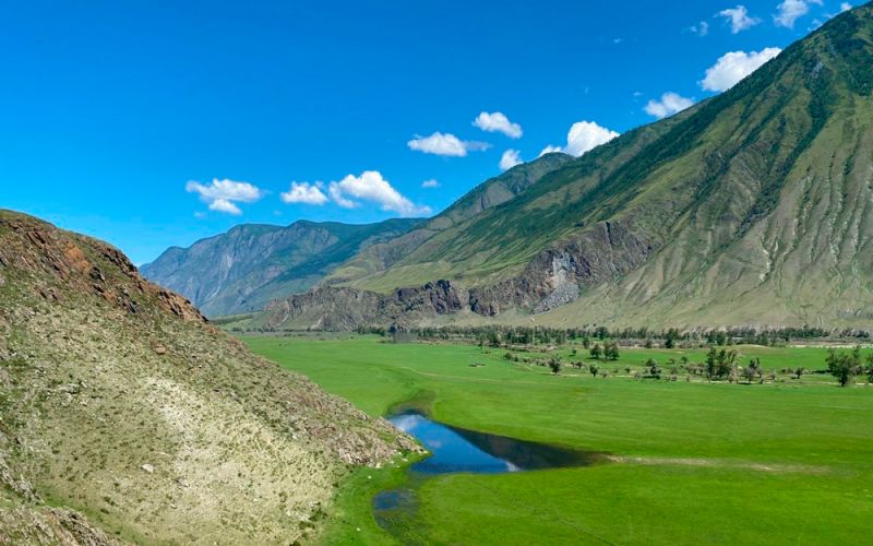 Это место невероятной красоты. Ровные зелёные луга, словно стриженные, настоящая альпийская Швейцария. Вдоль берегов пасётся скот. Тишина и умиротворение чувствуется во всем. Проезжаем Алтайские села Балыкча и Коо. Островерхие алтайские аилы-шестистенки, скудные огороды, овощеводства нет, кое-где растёт картофель. Население в основном занимается животноводством и в сфере туризма.