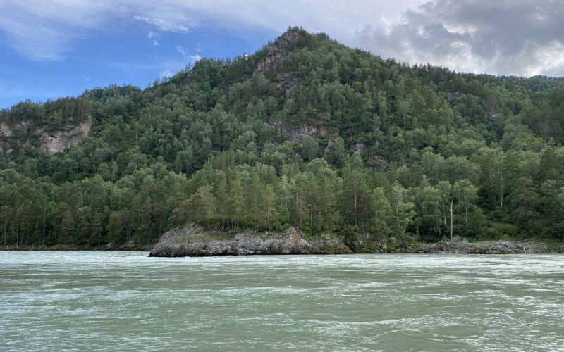 Отъезжаем километров 10 от «цивилизации» и останавливаемся на берегу Катуни в живописном месте между двух горных массивов. Высота их около 2000 м. Один густо покрыт смешанной тайгой на том берегу, а второй с более редкой растительностью, луговым разнотравьем и перелесками здесь, по другую сторону дороги. Единственный минус этого места, а может и плюс, как посмотреть на это, что тут совсем нет связи.