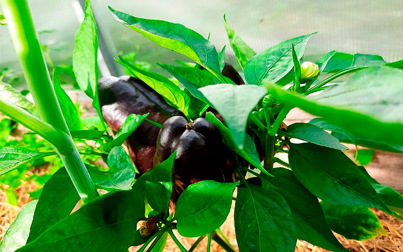 Перец Гигант чёрный F1. Посеян на рассаду во второй половине марта в торфяные таблетки, всхожесть 100 %. Росли хорошо. Высадила в теплицу в начале июня, из-за холодной весны. Перцы активно зацвели. Завязали плоды. Вот тут и начинается волшебство цвета. Только завязавшиеся перчики тёмно-зелёные, в течение недели становятся фиолетовыми, а затем совсем тёмными, почти черными. А к моменту созревания снова зеленеют, буреют и затем краснеют. Перчики среднего размера, весом 120-150 г, отдельные 200 г. и более. На кусте одновременно росло 6-8 перчиков. Кусты достаточно компактные. Мама, проходя по моему огороду, говорит: вот вечно ты меня путаешь, помидоры у тебя как перцы (это про томат Санькина любовь), перцы тёмные как баклажаны, а баклажаны как огурцы.