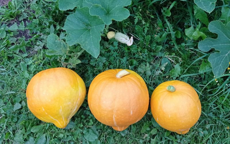 Снова сбор урожая тыквы сорта Русский деликатес. Первый раз это были две тыквы, а сегодня три, правда, меньшего размера. Завязей ещё довольно много.