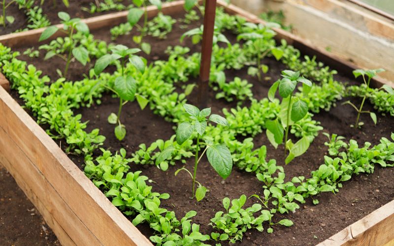 В уплотнительных посадках лучше использовать скороспелые и холодостойкие зеленные: редис, салат листовой и кочанный, кресс-салат, шпинат, кориандр, укроп, руколу, горчицу листовую. Кресс-салат – самый скороспелый, он бывает готов через 2 недели после посева, поэтому его можно выращивать в несколько сроков. Весь этот набор прекрасно соседствует с теплолюбивыми культурами.