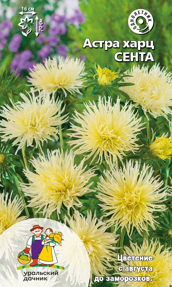 Растение пирамидальной формы, сильноветвистое, высотой 60–70 см. Соцветия жёлтые, полусферические, лучевые, махровые, в центре слегка закручены по спирали, 12–16 см в диаметре.