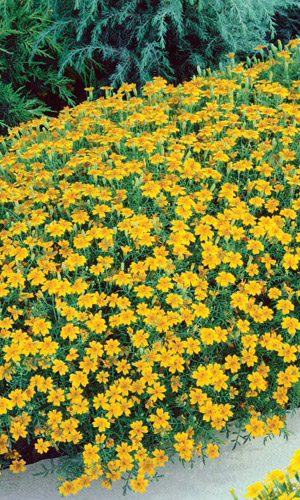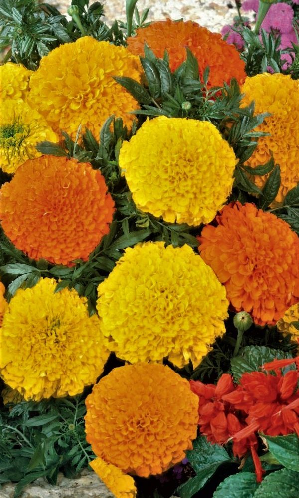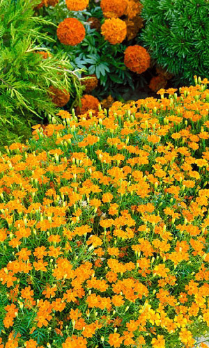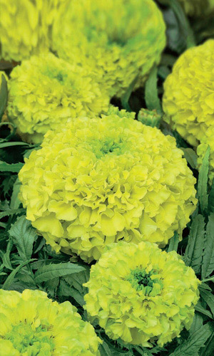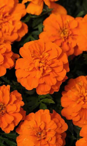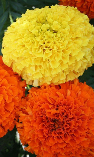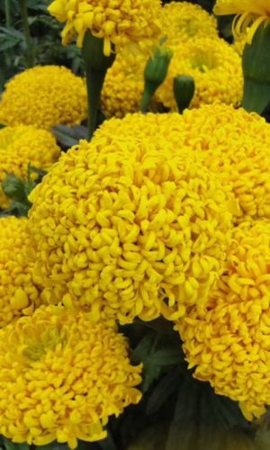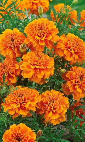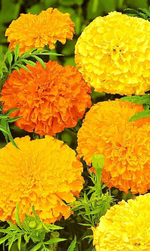 Великолепные крупные махровые соцветия. Куст компактный, высотой до 90 см. Побеги прочные, ребристые, светло-зелёные. Созвездия гвоздиковидные, полушаровидные, 8-10 см в диаментре, оранжевые, жёлтые, золотистые. Цветет с июля по октябрь. Используются для клумб, рабаток, высоких групп, на срезку. Растение теплолюбивое, засухоустойчивое...