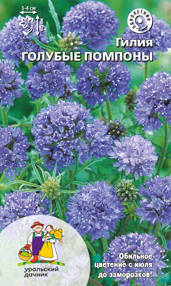 Изящное красивоцветущее многолетнее растение, выращиваемое как однолетнее. Гилия вполне может размножаться самосевом. Если вы оставите соцветия на семена, то какая-то часть их непременно перезимует и весной взойдет. Родом из Северной Америки, семейство Синюховые. Особую декоративность придают красиво изрезанные изумрудно-зелёные листья и сочно-голубые помпоны соцветий. Побеги высотой до 60 см увенчаны многочисленными густыми очаровательными соцветиями тёмно-голубого цвета, каждое соцветие может состоять из ста и более цветов. Растение светолюбивое, холодостойкое, переносит заморозки. Неприхотливо к условиям выращивания. Цветёт обильно и продолжительно. Превосходно подходит для украшения альпийских садиков, цветников, рабаток, для оформления вазонов и балконных ящиков.