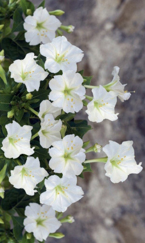 Многолетнее растение, используется как однолетнее. Большие, благоухающие кусты мирабилиса, сплошь усыпанные яркими звездочками цветов, создают неповторимую атмосферу в вечернем саду. Ароматные, белоснежные цветки раскрываются после 15 часов, а закрываются утром. Цветёт обильно, с июня до заморозков. Используют для оформления клумб, миксбордеров, газонов, балконов.