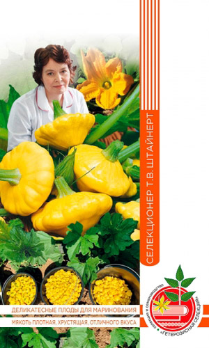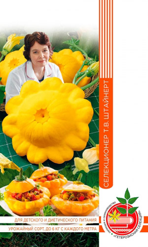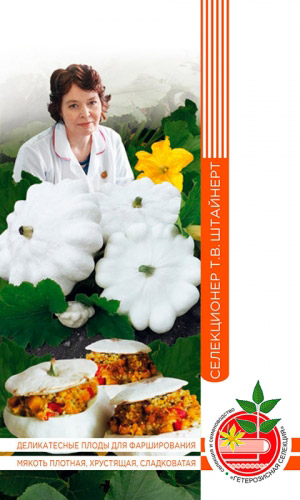 Высокоурожайный, раннеспелый, кустовой сорт с необычной окраской плодов. Плоды дисковидной формы, с зубчатыми краями, массой 300-600 г, тёмно-зелёные, почти чёрные, с повышенным содержанием аскорбиновой кислоты (витамина С). Мякоть белая, плотная, оригинального вкуса.Ценность сорта: высокая урожайность, быстрое созревание плодов, отличные вкусовые качества, устойчивость к болезням. Рекомендуются для консервирования, запекания, тушения...