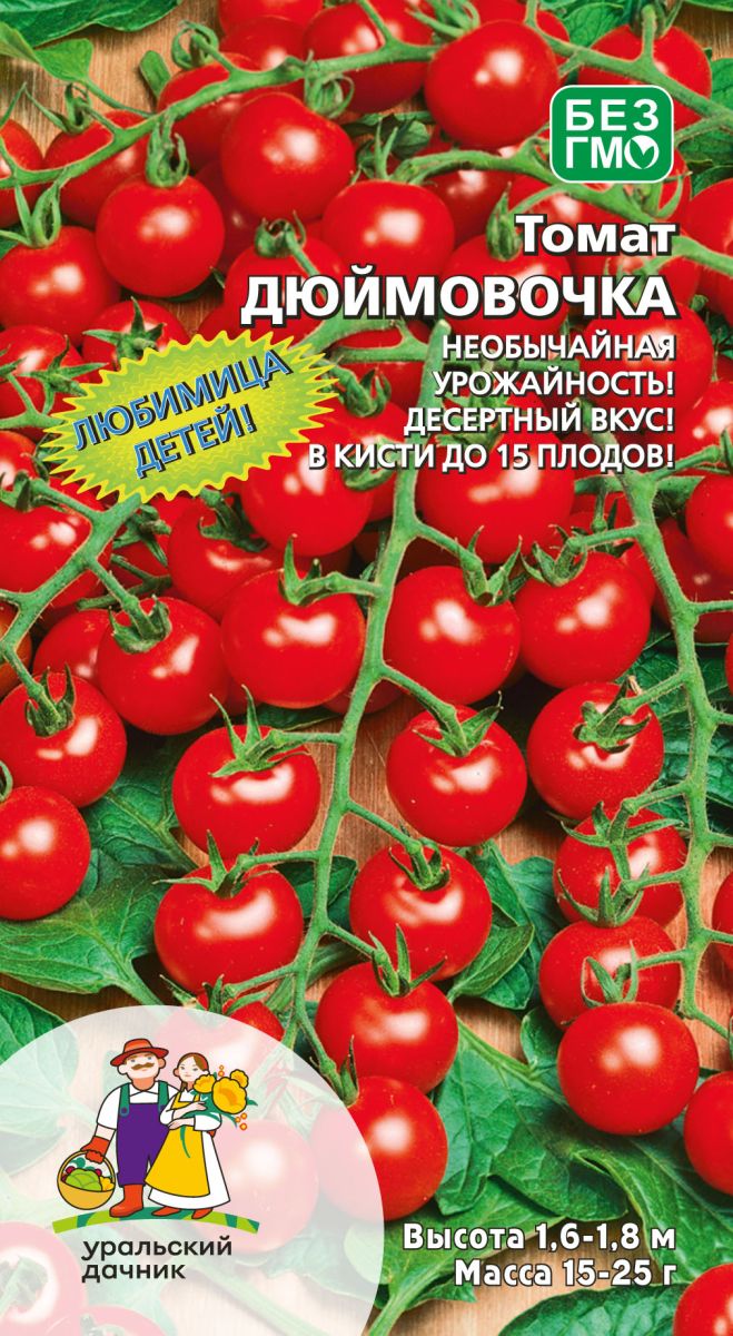 Раннеспелый (90-95 дней). Растение индетерминантное. Лист крупный, зелёный. Соцветие простое. В кисти до 15 плодов. Кисти хорошо выполнены, не рыхлые. Плодоножка без сочленения. Плод округлый, гладкий, плотный. Окраска незрелого плода зелёная, зрелого - красная. Число гнезд 2. Масса плода 15-20 г. Вкус отличный.