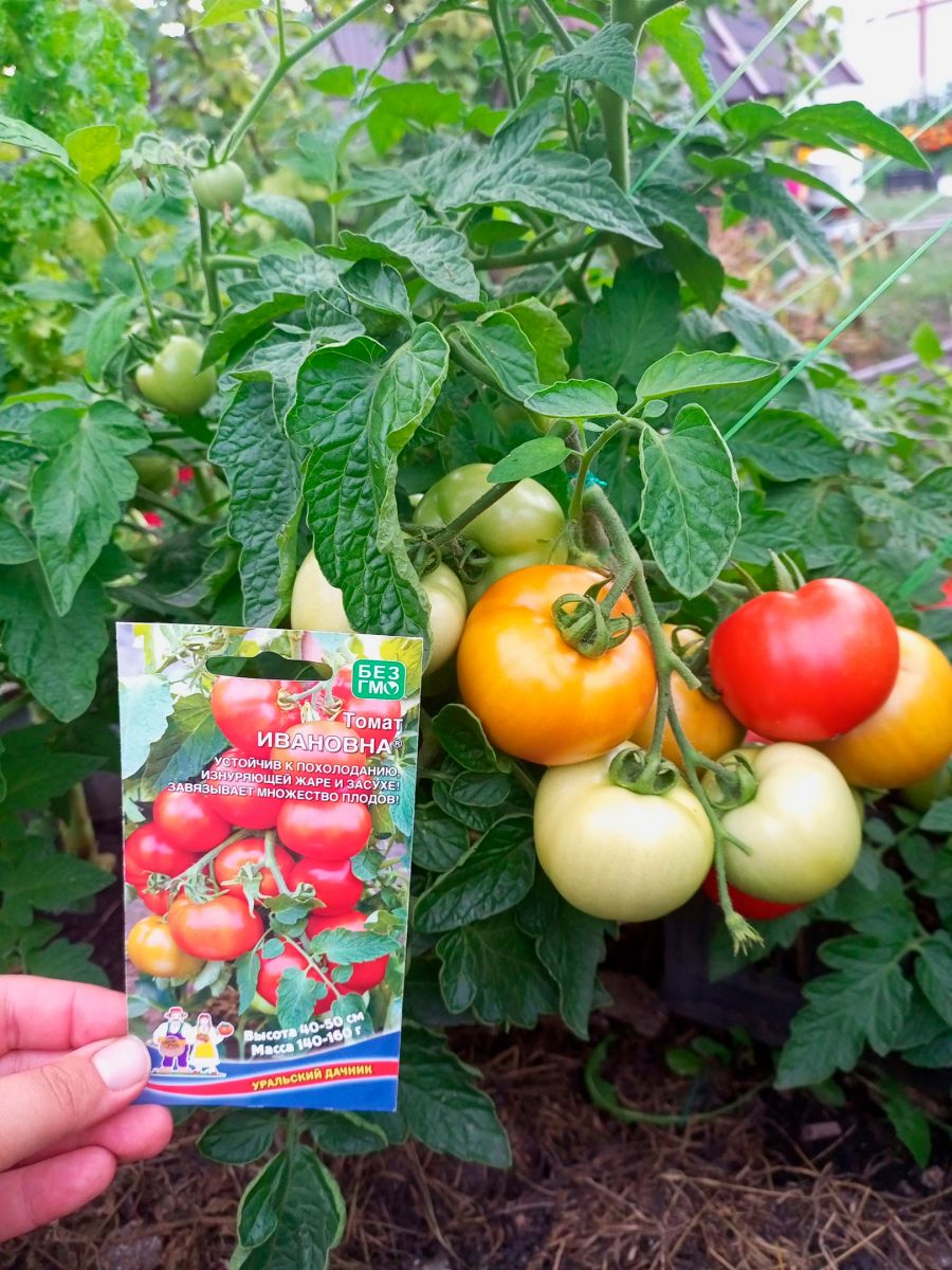 Один из лучших раннеспелых сортов Челябинской селекции для возделывания как в открытом грунте, так и плёночных теплицах. Растение полураскидистое, высотой 50 см, с множеством кистей, а в каждой по 5-6 плодов, причём каких плодов: красивых, ровных, плоскоокруглой формы, многокамерных и мясистых, пунцово-красного цвета, слаборебристый. Масса каждого плода до 160 г. Плоды плотные, не растрескиваются. Засухоустойчив, имеет высокий процент завязываемости плодов в экстремальных условиях. Сорт Ивановна, как настоящая русская женщина, и в избу войдёт и коня на скаку остановит, так и томат обладает уникальной устойчивостью как к холоду, так и к изнуряющей засухе.