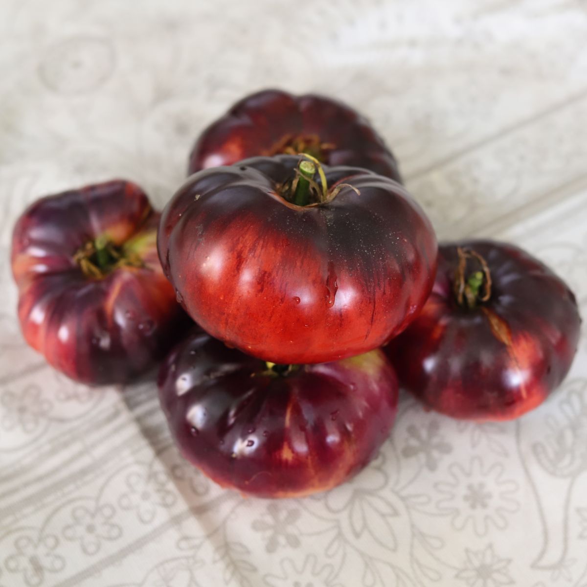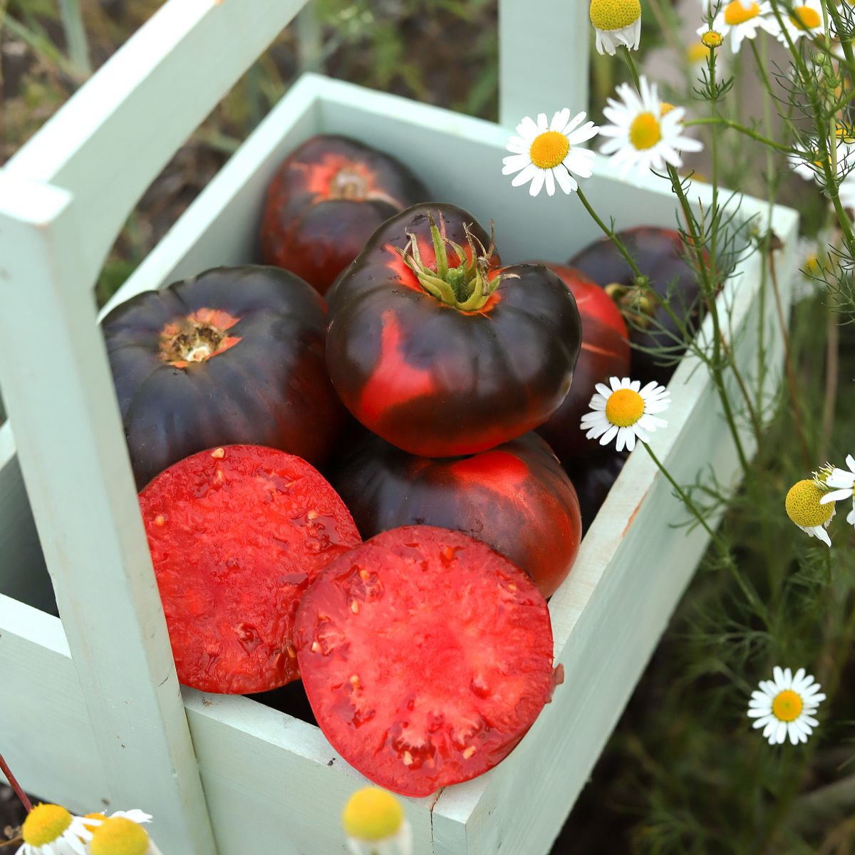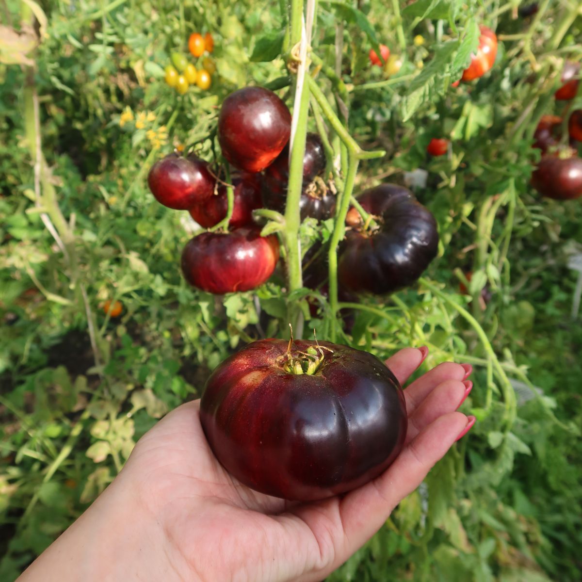 Среднеспелый, индетерминантный гибрид. Высота растений в защищённом грунте достигает 1,7-2 м. Период от всходов до получения урожая 110-113 дней. При наступлении технической спелости зелёные завязи постепенно приобретают насыщенную фиолетово-чёрную окраску. Употреблять томаты начинают при появлении на этом тёмном фоне ярко-красных полос и боков. Масса плодов около 180-200 г, при хорошем уходе вес первых томатов превышает 350 г. Мякоть красная, мясистая, сладкая. Необычная окраска томатов внесёт разнообразие в привычные овощные салаты и закуски.