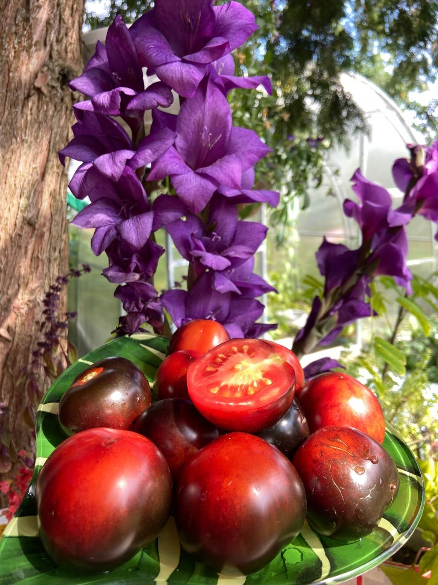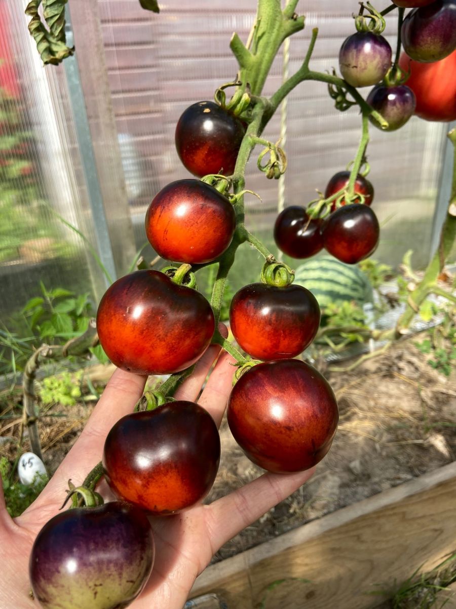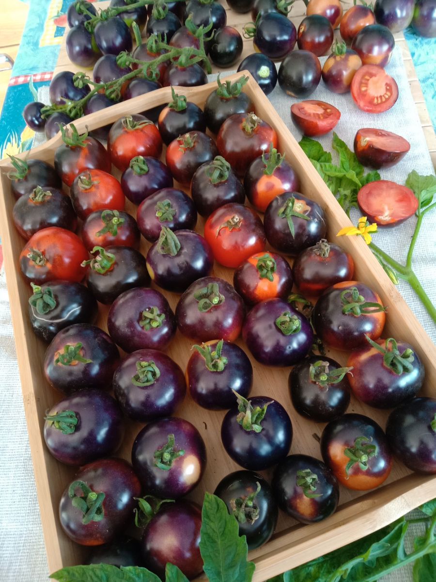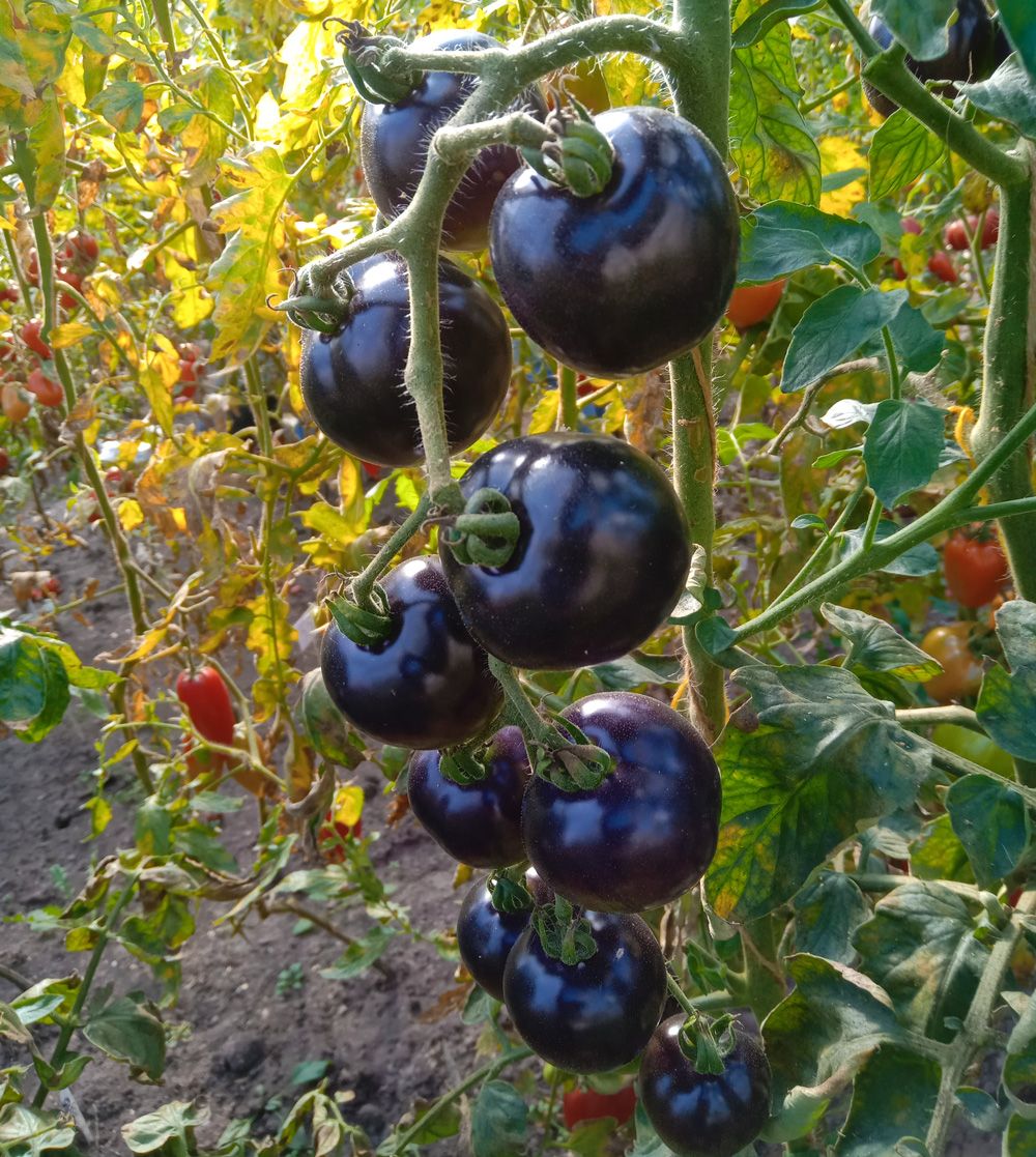 Плоды округлые, тёмно-фиолетовые (почти чёрные), мясистые, сладкие, с повышенным содержанием каротиноидов и антоциана – мощного антиоксиданта. Сорт индетерминантный раннеспелый и очень урожайный.